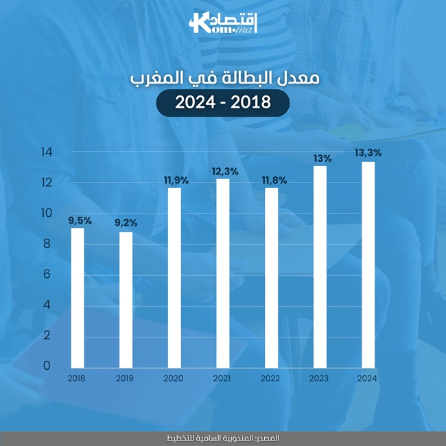 أعلنت المندوبية السامية للتخطيط، عن ارتفاع معدل البطالة من %13 إلى %13,3 على المستوى الوطني، ومن %16,8 إلى %16,9 بالوسط الحضري، ومن %6,3 إلى %6,8 بالوسط القروي.