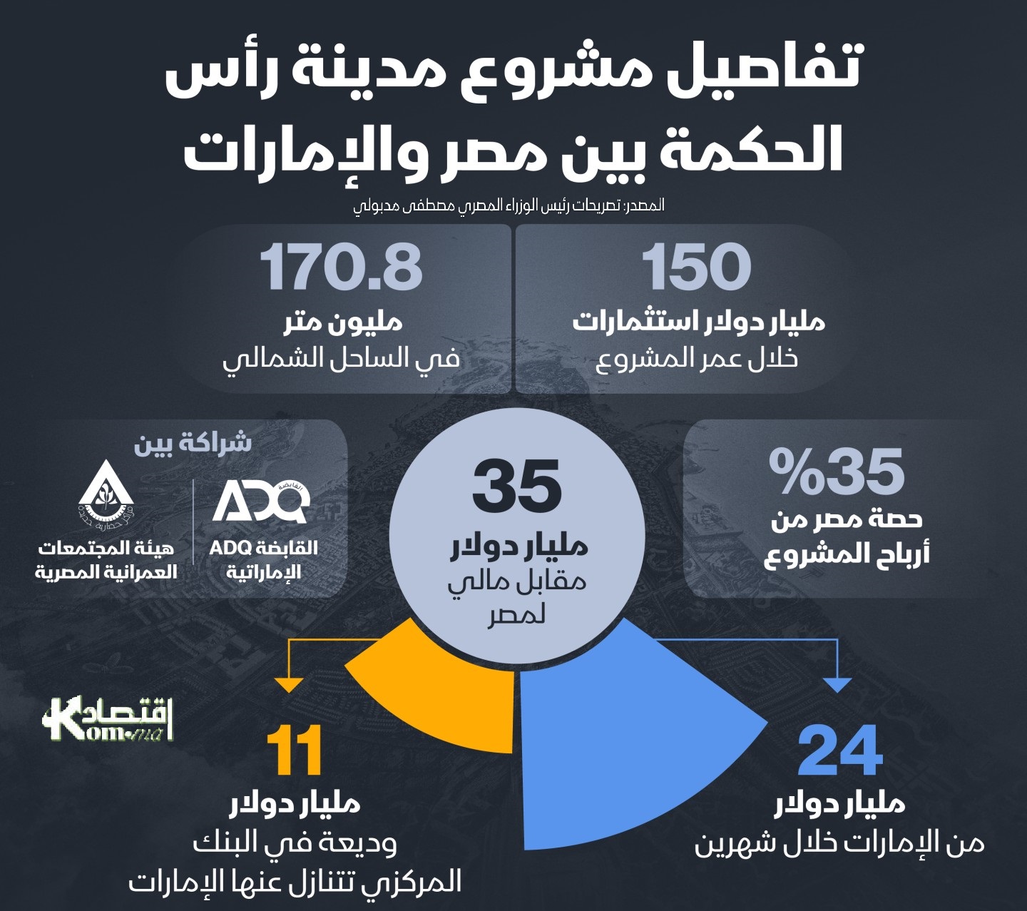 وقعت مصر، في فبراير 2024، عقدا لتطوير وتنمية مدينة رأس الحكمة في الساحل الشمالي بشراكة استثمارية مع الإمارات في ما وصفه رئيس الوزراء مصطفى مدبولي بأنها "أكبر صفقة استثمار أجنبي مباشر في تاريخ البلاد". الصفقة تتضمن استثمارا أجنبيا مباشرا بقيمة 35 مليار دولار، حيث تحصل مصر على "35 % من أرباح المشروع". وتوقع مدبولي أن يحقق المشروع الاستقرار النقدي للبلاد ويساهم في كبح جماح التضخم والقضاء على السوق الموازية للدولار.